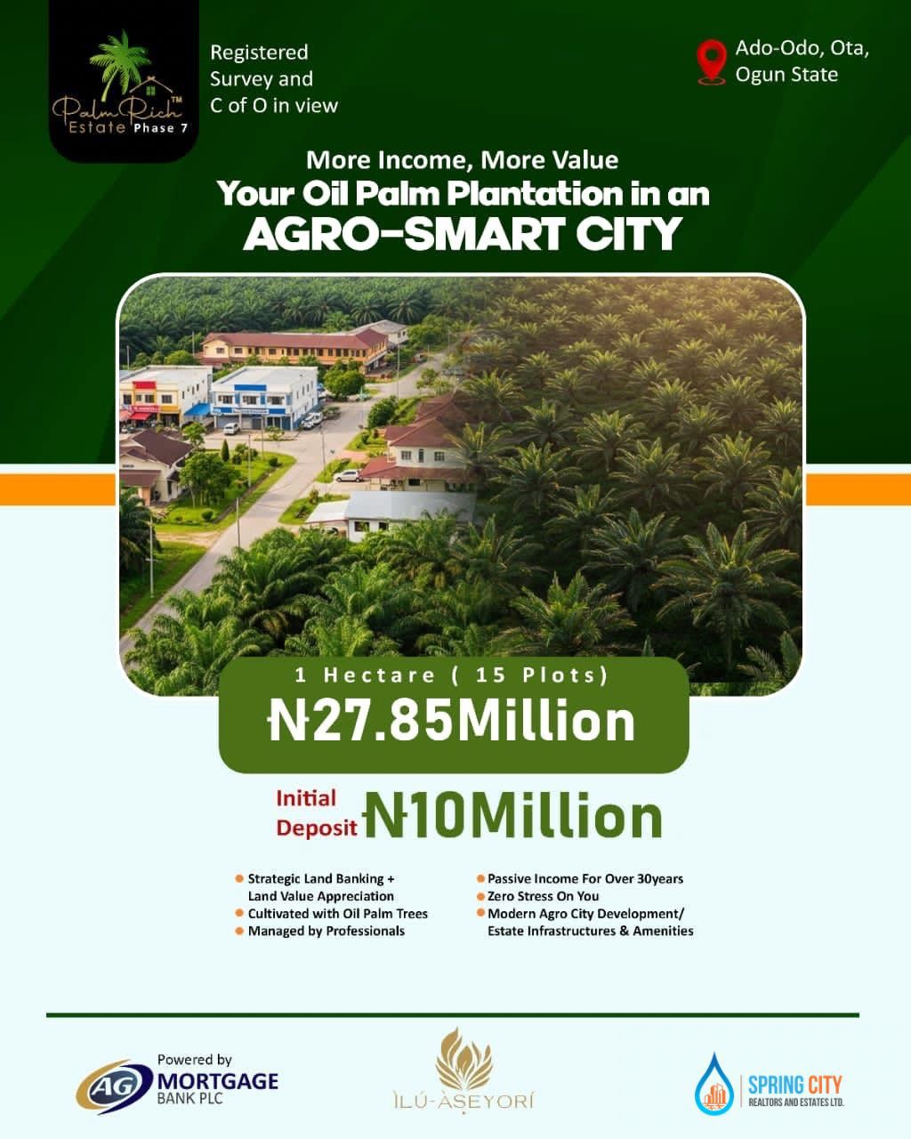 The Agro Smart City is Assetrise’ innovative solution to wealth creation and sustainability, through an ecosystem powered by Agriculture, commerce and Technology. It is Africa’s premiere and largest Agro Smart City. This is why Palmrich Phase 7️⃣ is not just about Agriculture, it is a unique strategic Land ownership model with Oil-Palm plantation.